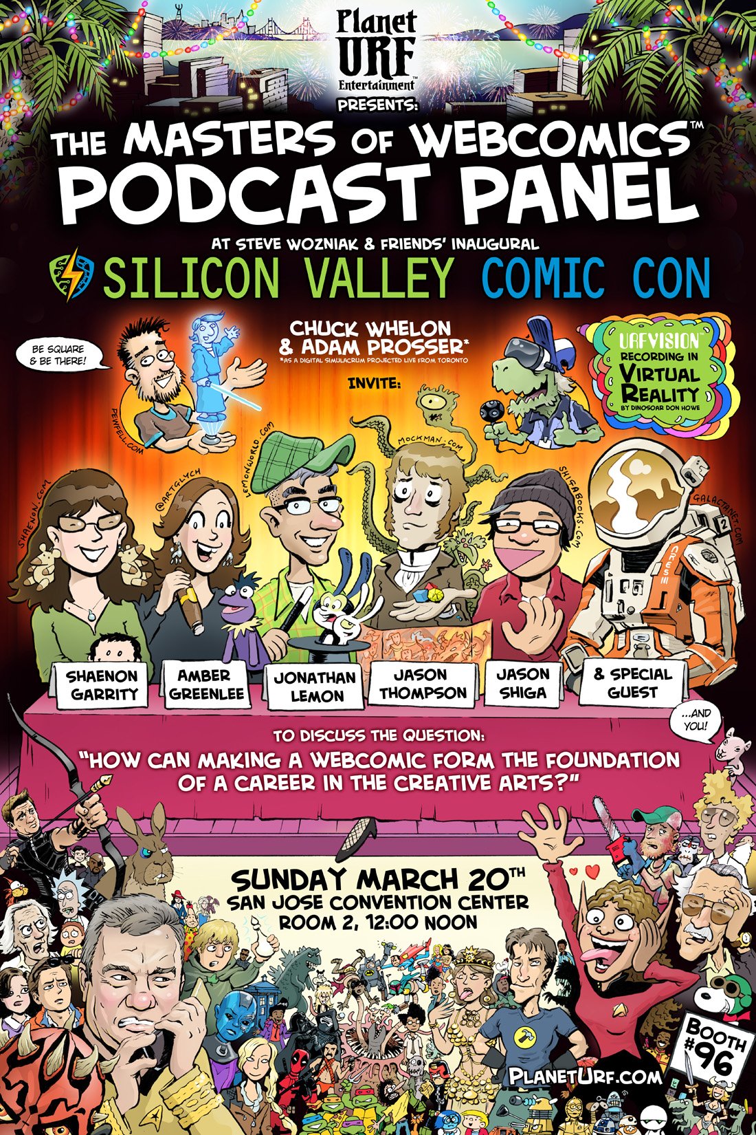 Here is the very exciting “Masters of Webcomics” panel I hosted at the 2016 Silicon Valley Comic Con. The panel took place on Sunday, March 20th, in Room 2 at 12:00 noon.