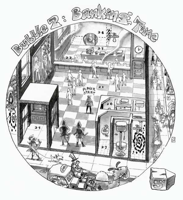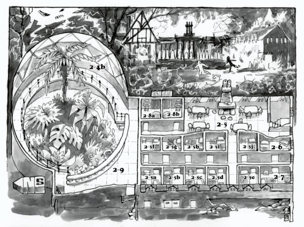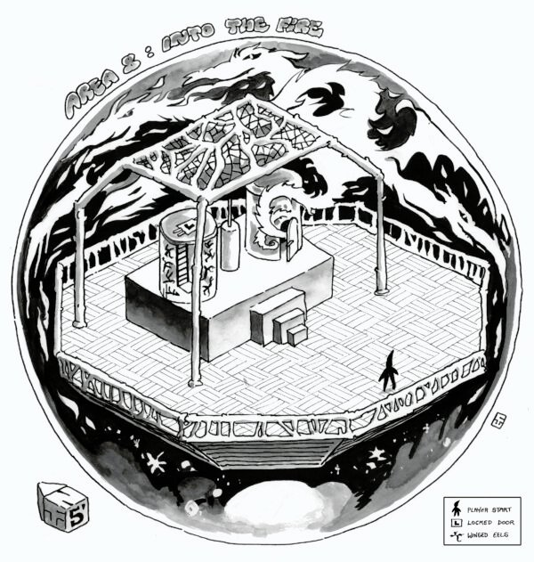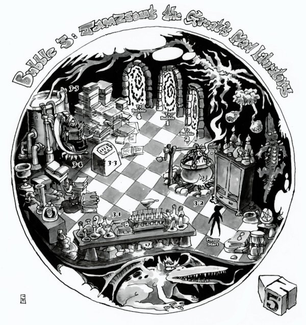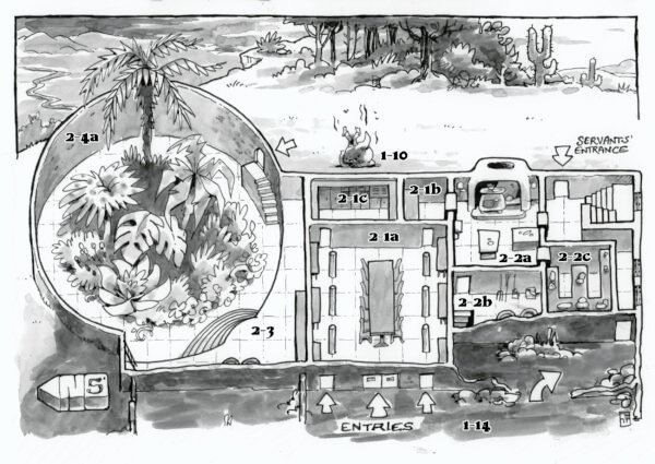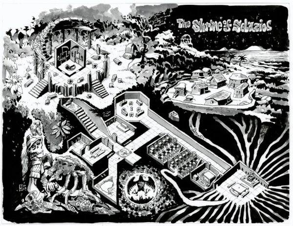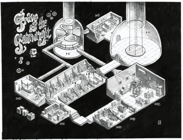 More recently, Chuck has focused on creating illustrated maps for Goodman Games. These maps combine many aspects of his work — from character design and environment illustration to clever visual storytelling — creating fully realized, engaging spaces for players to explore. His maps not only serve as practical gaming tools but also stand alone as pieces of art that capture the imagination.