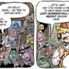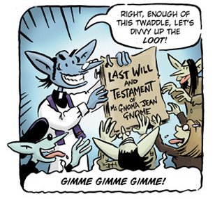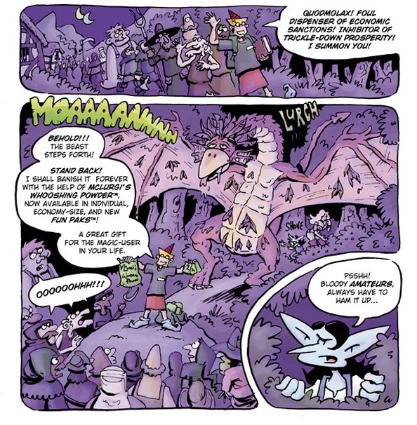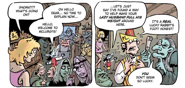 Now that he’s a father, Pewfell is determined to achieve success in his chosen career of wizardry, but somehow it continues to elude him. When his perpetually pesky tenant, Gnoma, is apparently killed in the act of remodeling his house, it looks like a new opportunity might be about to open up for Pewfell in the country… Take a trip to Planet Urf for a tale of battling barbarian babes, demented robot clerics, devious gnomic real-estate agents, demonically-run corporations, and a slightly slimy, slug-like children’s entertainer named Strangeblob Nopants.
