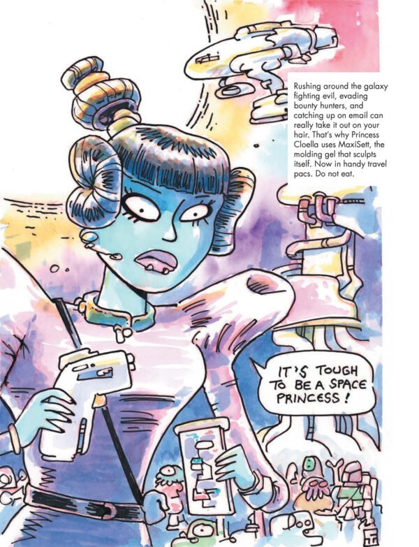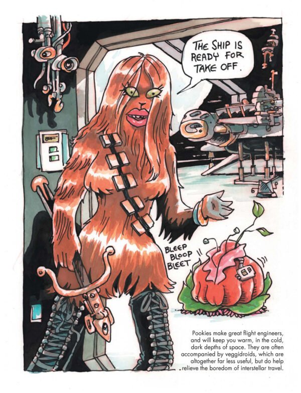 In Urfsapce Beyond Into the Radlands, Whelon creates futuristic dystopian cartoon worlds that parody and reimagine classic sci-fi and post-apocalyptic tropes. You’ll find references to everything from Mad Max to 1950s atomic-age fears, all filtered through a unique cartoon lens. The result is a book that is both a parody and a celebration of post-apocalyptic storytelling that will teach you not to fear the fallout!
