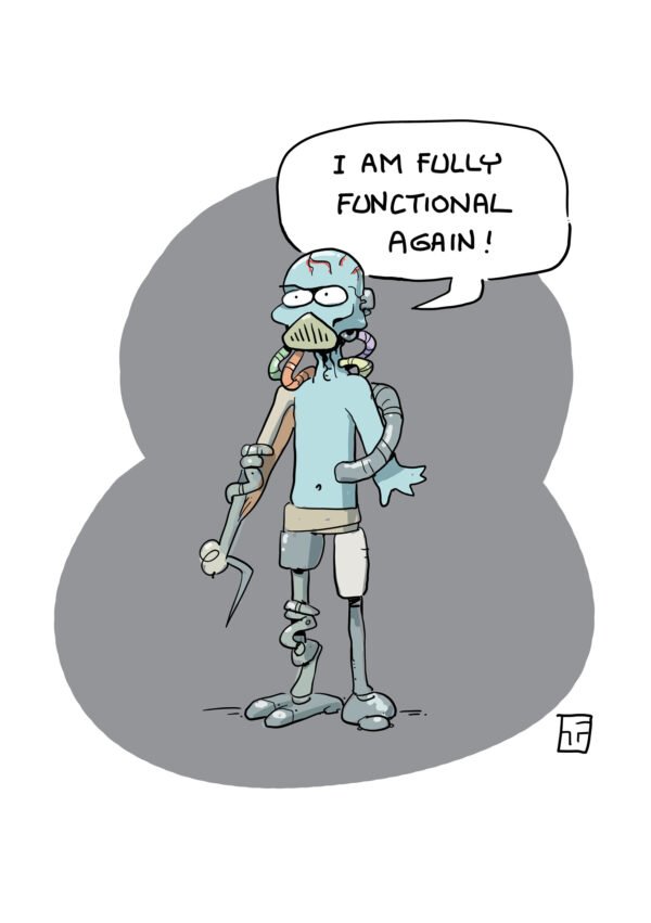 Humorous Sci-Fi Scenarios – Robots misbehave, spaceships malfunction, and strange creatures create chaos across futuristic cities and starships.