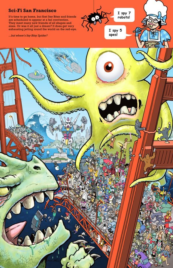 Itsy Bitsy Spider and a cast of merry Mother Goose characters enter a talent contest and embark on a world tour. Follow their adventures across 12 highly-detailed double-page search-and-find scenes, from London’s West End, to San Francisco’s Golden Gate Bridge.