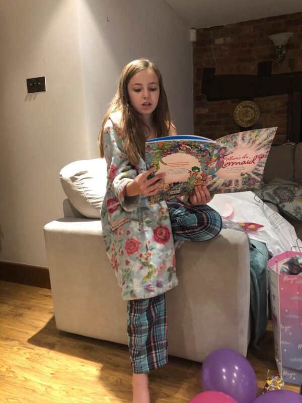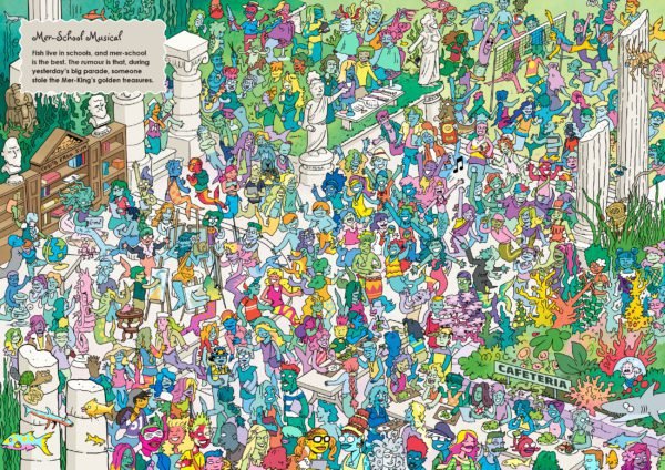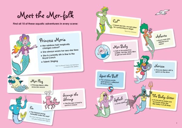 Where’s the Mermaid? invites readers to dive into a dazzling undersea adventure. Join Meria, her mer-friends, and the adorable Mer-Pug as they journey through 16 richly illustrated locations. From the Mer-King’s birthday parade and an underwater rock concert to a circus, a sushi bar, and a paradise beach, each page bursts with colorful detail and playful challenges.
