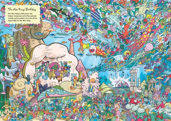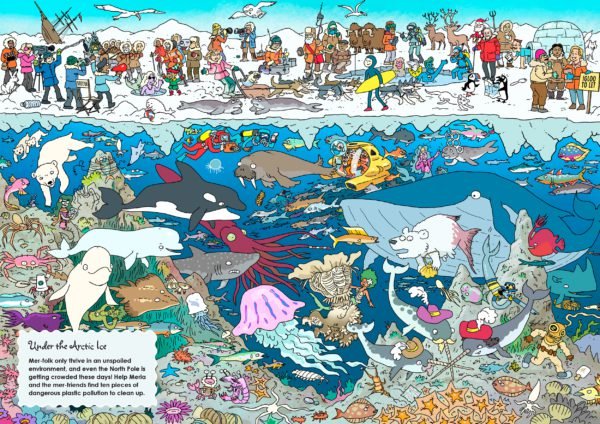 Immerse yourself in the bright and beautiful world of mermaids. Follow Meria, her mer-friends and Mer-Pug, on a global adventure to 16 detailed locations. From the Mer-King’s birthday parade to an underwater rock concert via the circus, a sushi bar and a paradise beach, there are loads of fun scenes to explore. Includes a special Arctic spread and extra challenge to find 10 pieces of dangerous plastic. You might even spot David Attenborough.