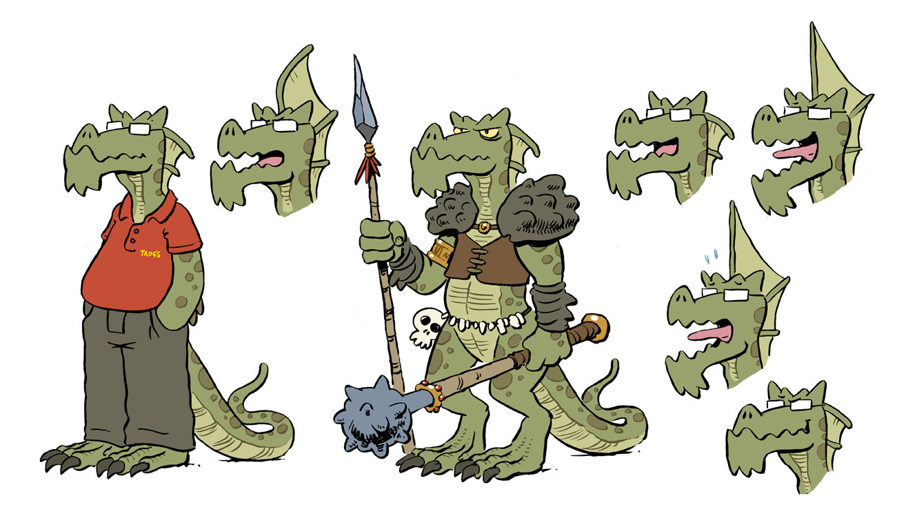 Trogs is a comic strip series I developed for a boardgame industry news site, scripted by myself and my Pewfell co-writer Adam Prosser. It was a great idea, about a specialty game retail store called Trog’s Games Portal, owned and run by a troglodyte, who lived in the caves beneath the store with his very large family. The idea was to parody the goofy characters encountered in the obscure world of boardgame fandom. I wish it could have run longer, but the budget just wasn’t there for me to be able to spend the time to keep it going, and I ended up getting busy with bill-paying work! If anyone’s interested in financing the thing, we had tons of ideas for it and I’d love to get it going again someday!