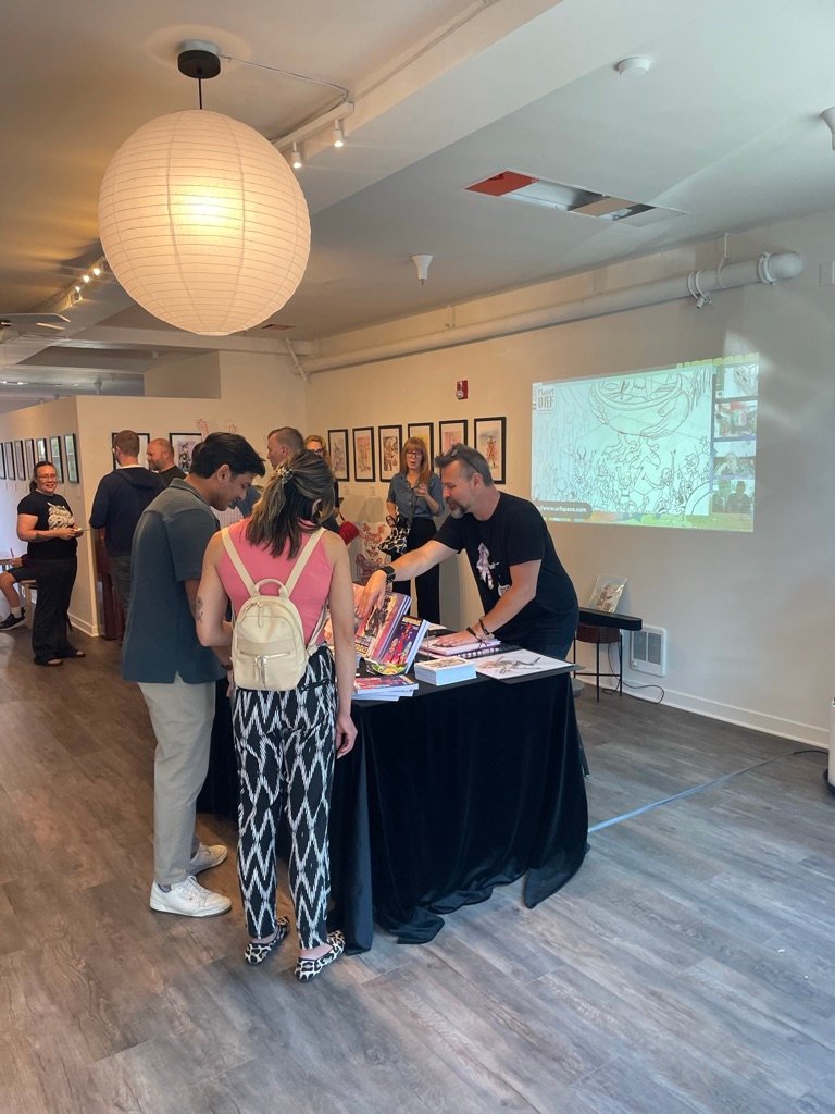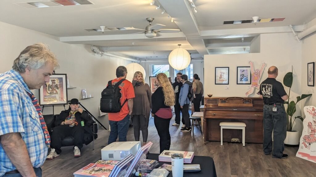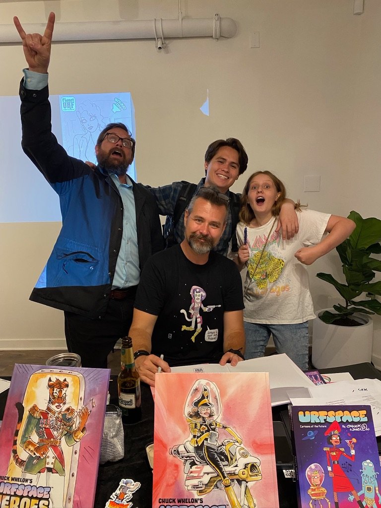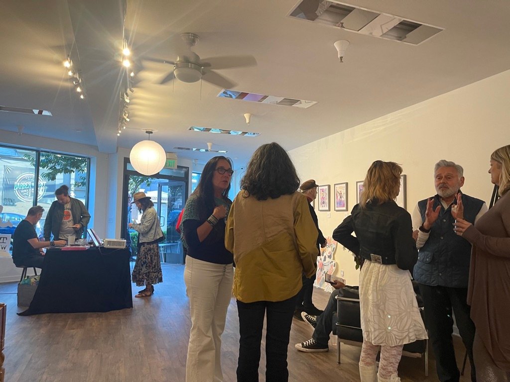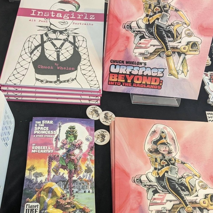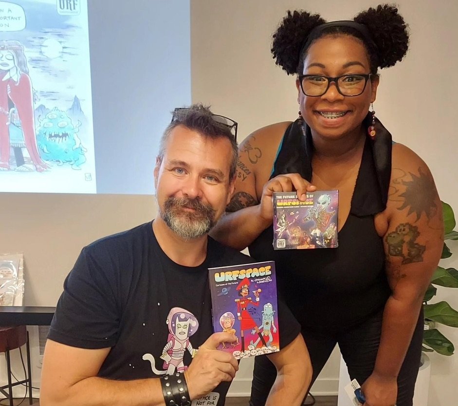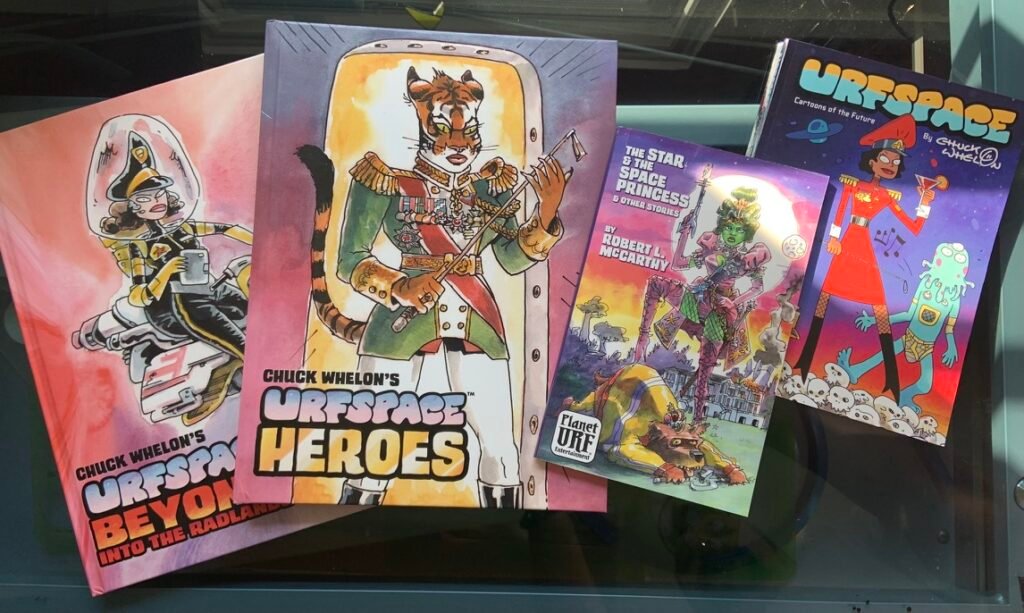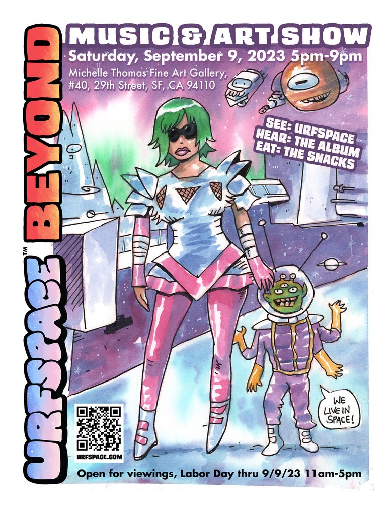 An art show of original watercolor artworks from Urfspace Beyond: Into the Radlands, the latest book by San Francisco-based artist and author, Chuck Whelon, successfully funded on Kickstarter in August 2023. Chuck signed copies of the book, a colorful cartoon tour of the future, including stories, poems and cosmic space persons. Two other new titles from Planet Urf Entertainment were also released: The Future Sounds of Urfspace CD, a soundtrack album of 19 original tunes from current Bay Area bands, and “The Star and the Space Princess” a book of sci-fi short stories by author, Robert L. McCarthy, who was also in attendance.
