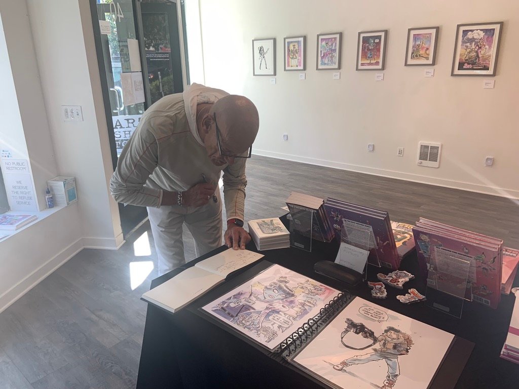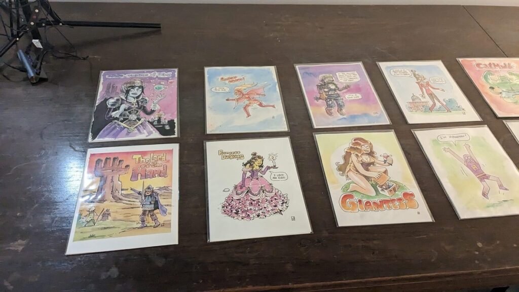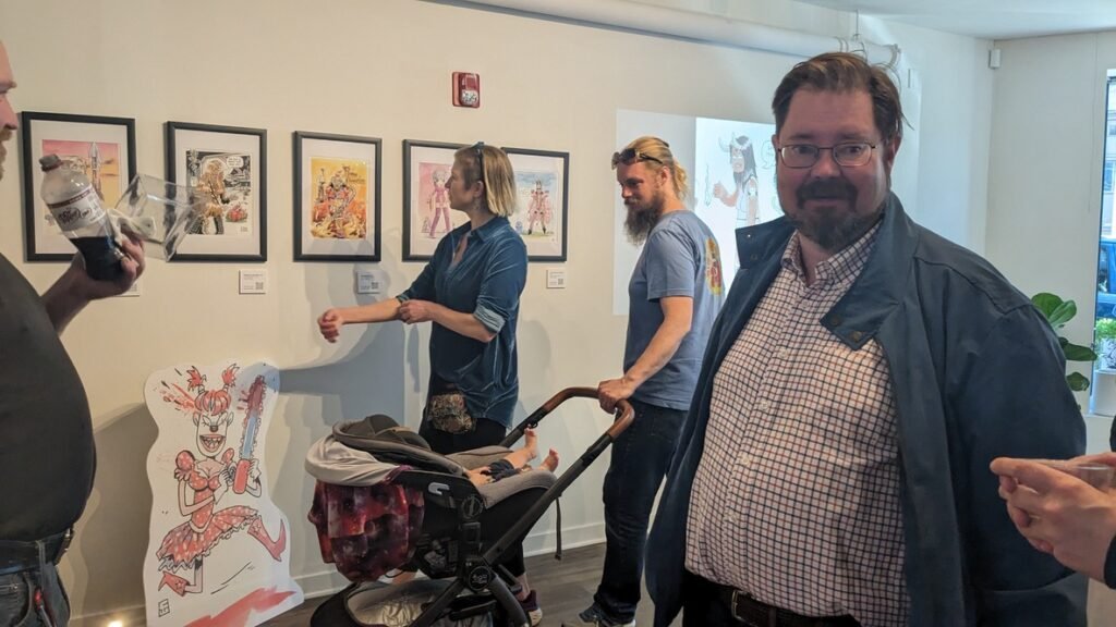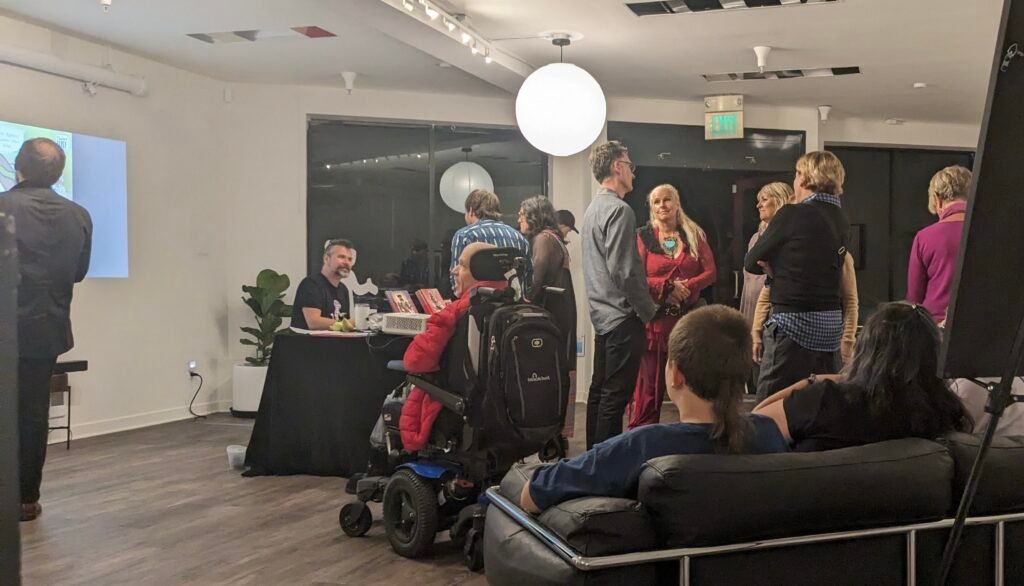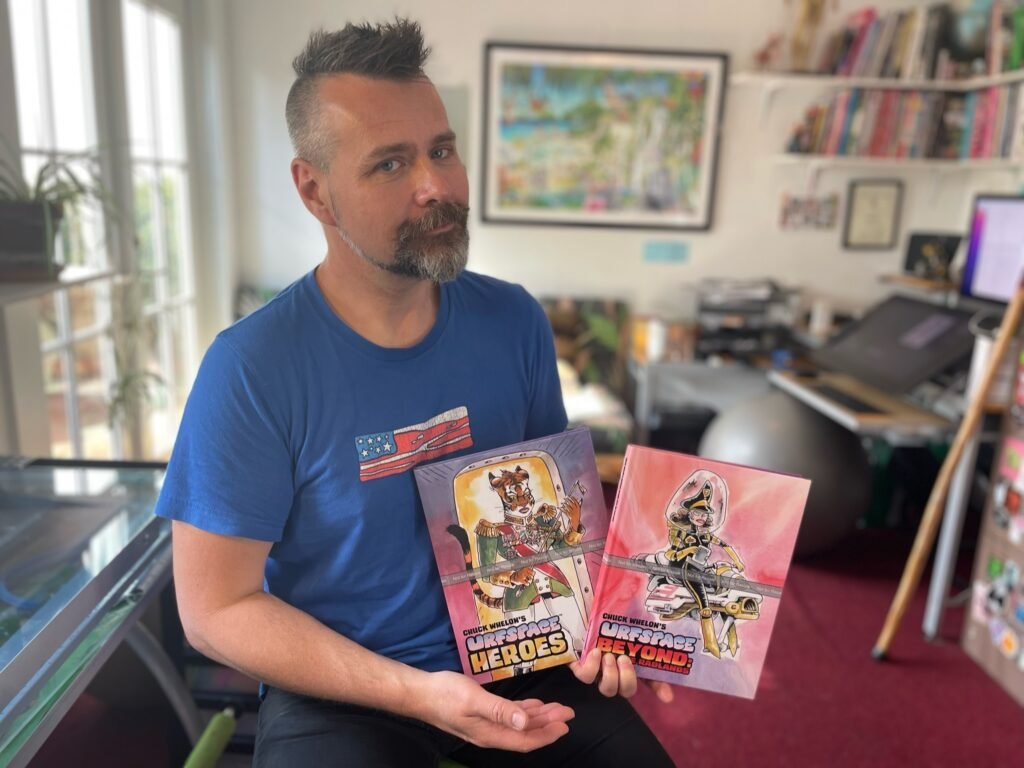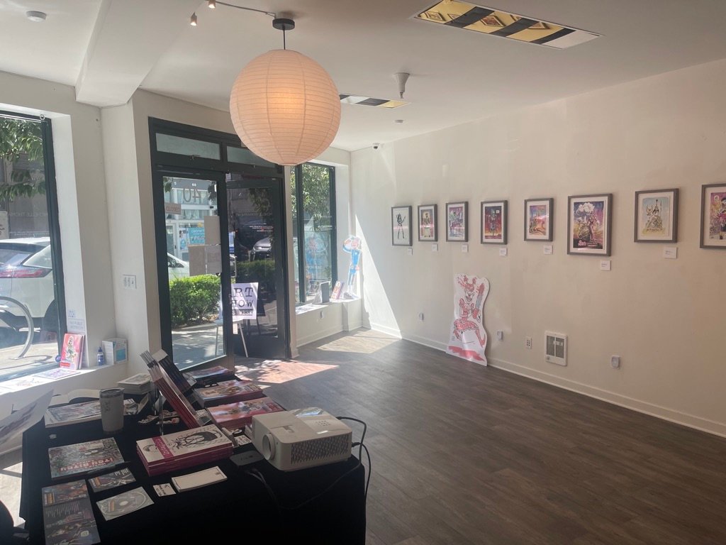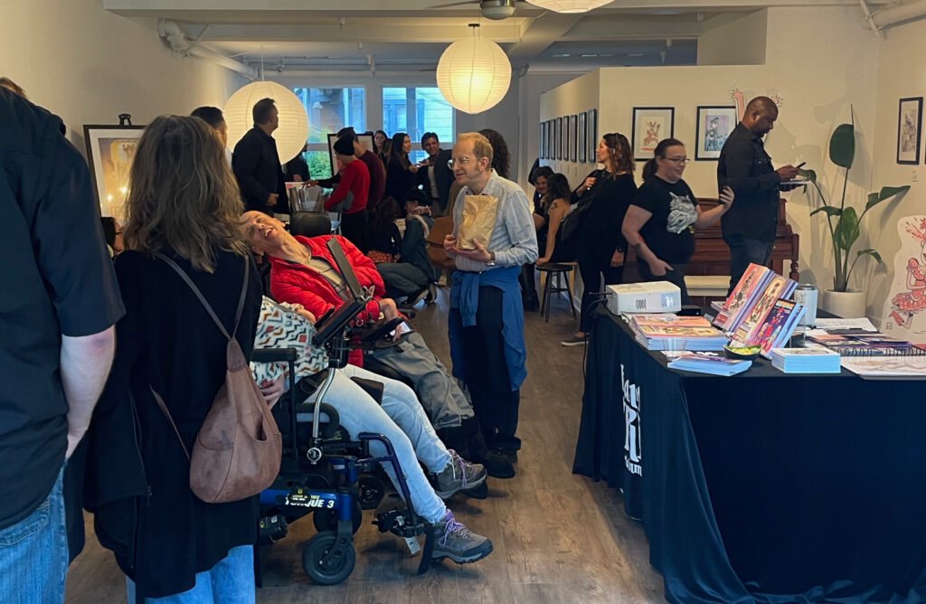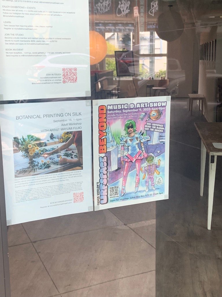 An art show of original watercolor artworks from Urfspace Beyond: Into the Radlands, the latest book by San Francisco-based artist and author, Chuck Whelon, successfully funded on Kickstarter in August 2023. Chuck signed copies of the book, a colorful cartoon tour of the future, including stories, poems and cosmic space persons. Two other new titles from Planet Urf Entertainment were also released: The Future Sounds of Urfspace CD, a soundtrack album of 19 original tunes from current Bay Area bands, and “The Star and the Space Princess” a book of sci-fi short stories by author, Robert L. McCarthy, who was also in attendance.