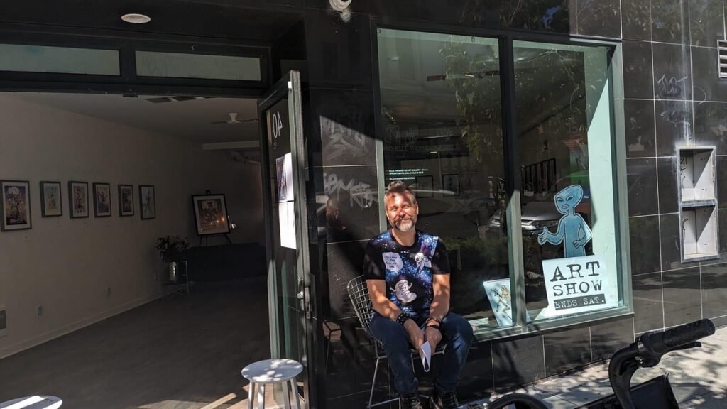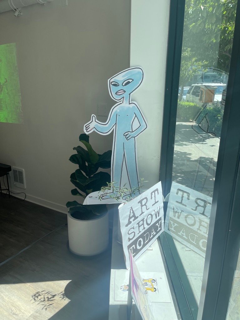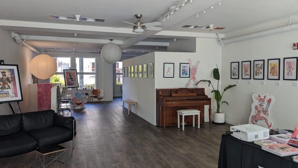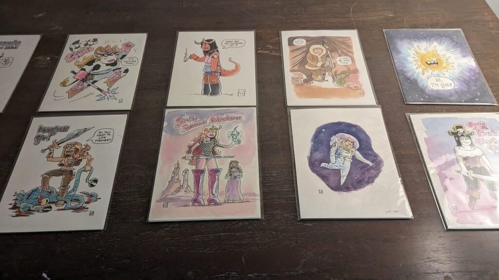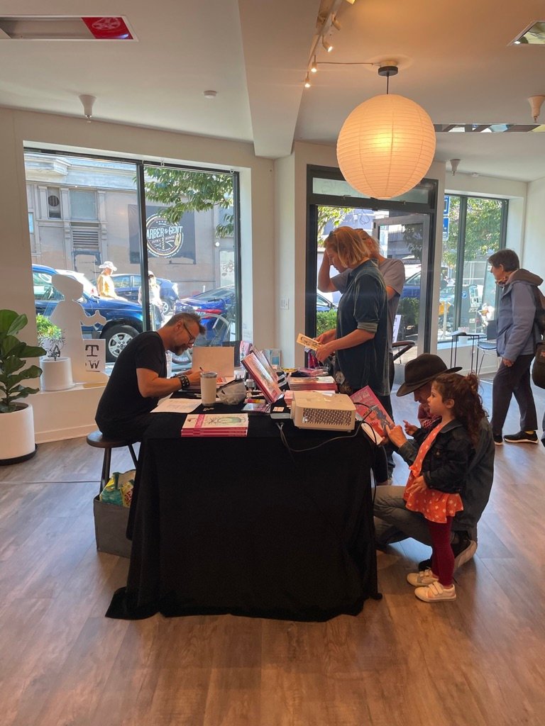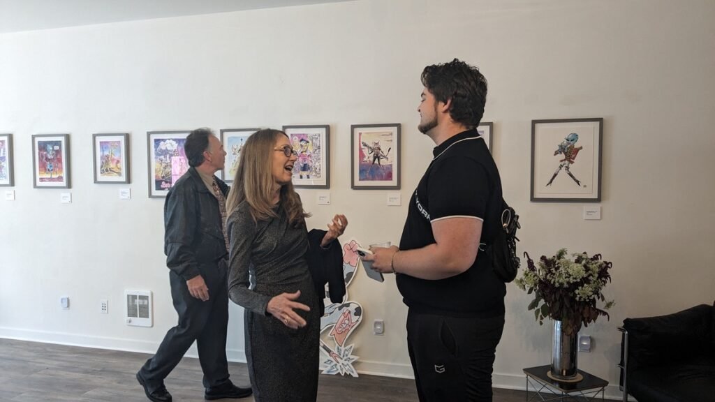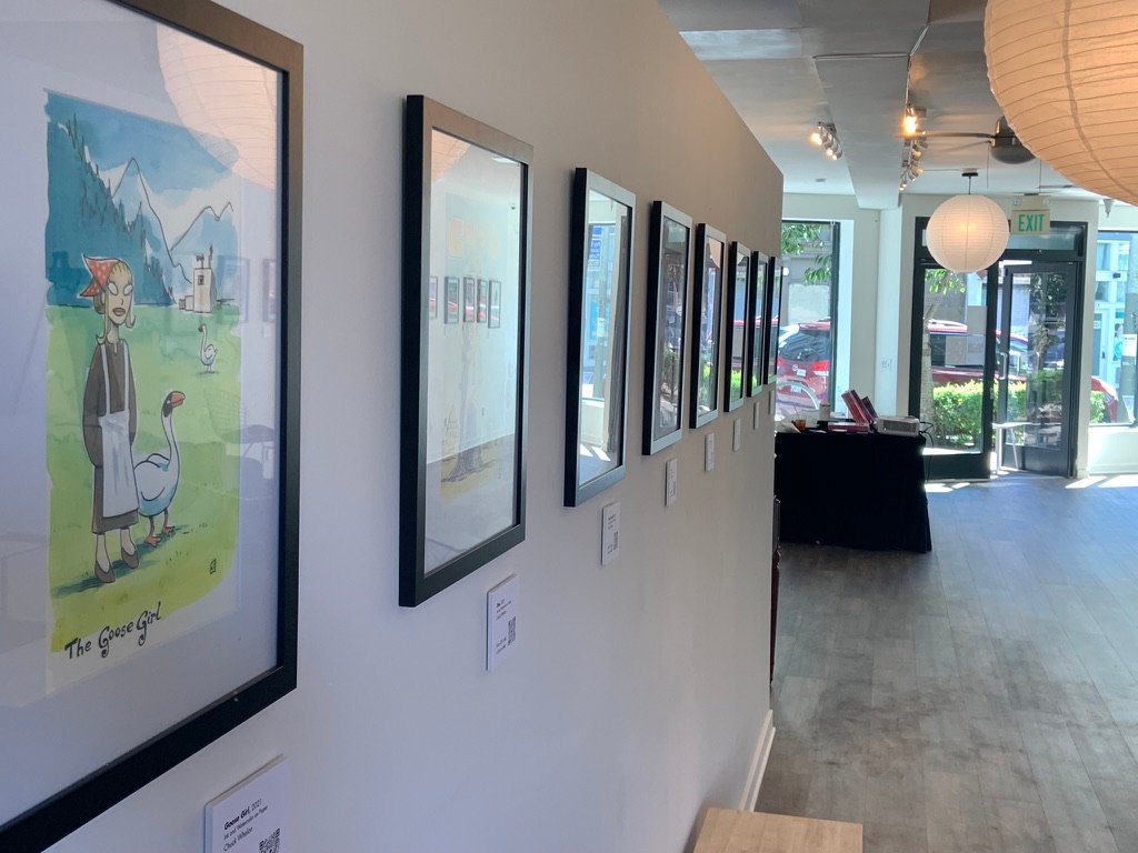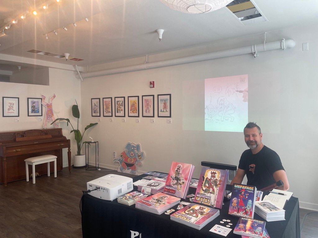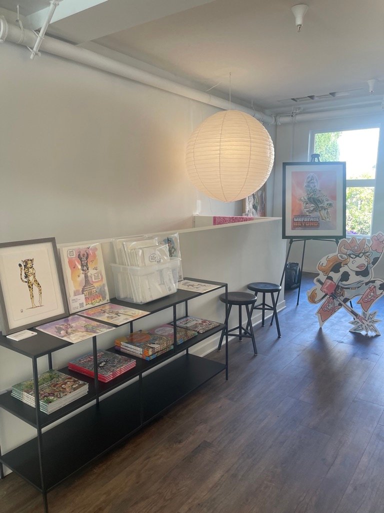 An art show of original watercolor artworks from Urfspace Beyond: Into the Radlands, the latest book by San Francisco-based artist and author, Chuck Whelon, successfully funded on Kickstarter in August 2023. Chuck signed copies of the book, a colorful cartoon tour of the future, including stories, poems and cosmic space persons. Two other new titles from Planet Urf Entertainment were also released: The Future Sounds of Urfspace CD, a soundtrack album of 19 original tunes from current Bay Area bands, and “The Star and the Space Princess” a book of sci-fi short stories by author, Robert L. McCarthy, who was also in attendance.