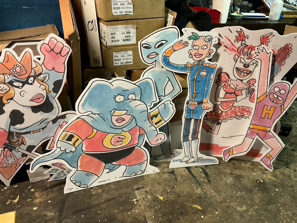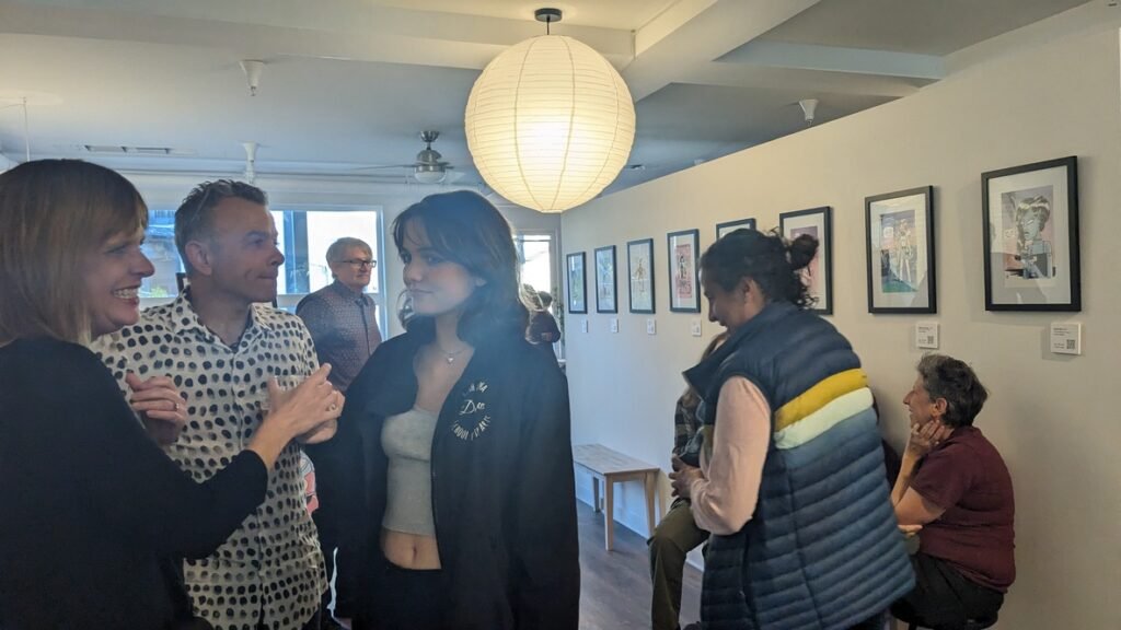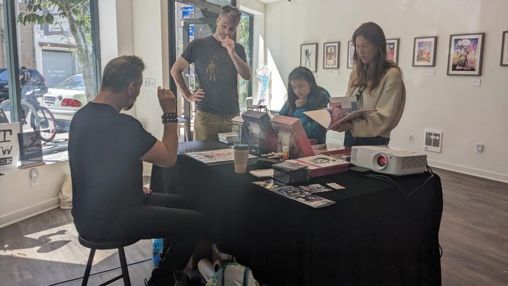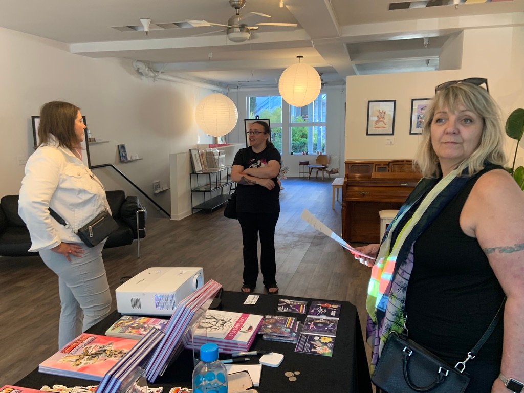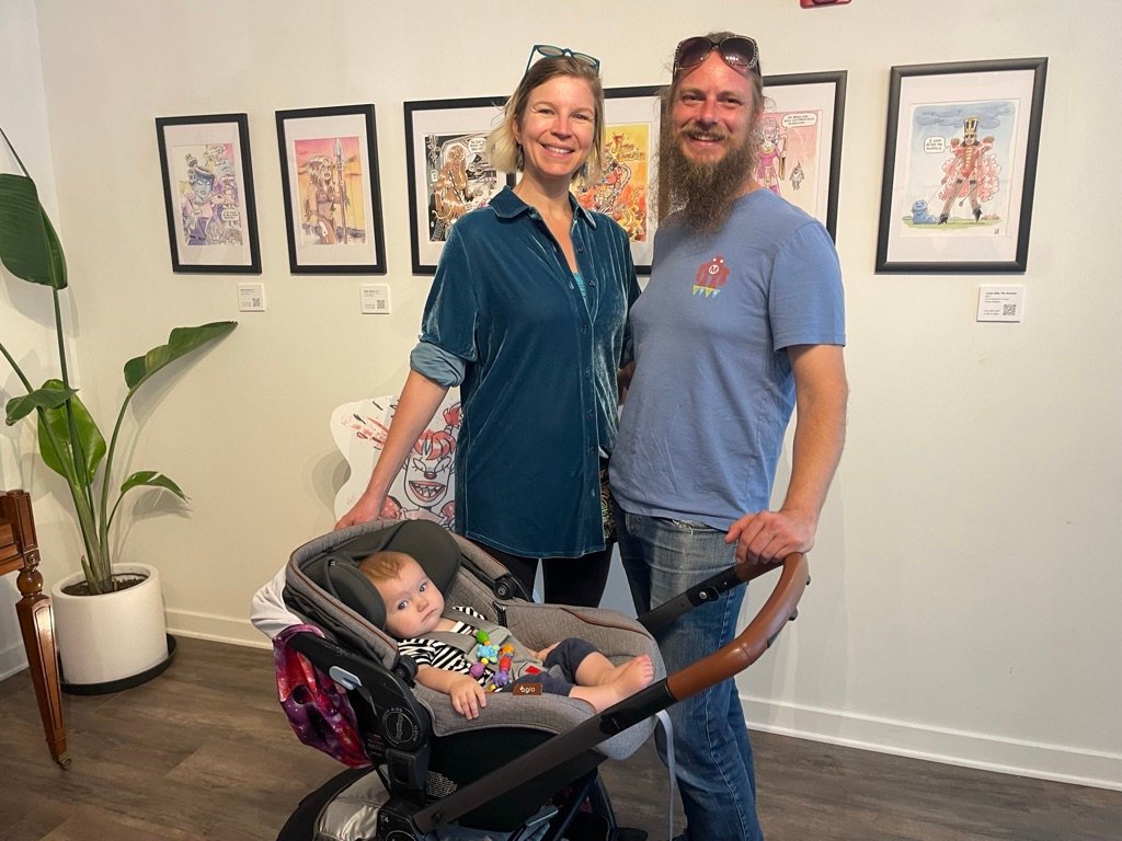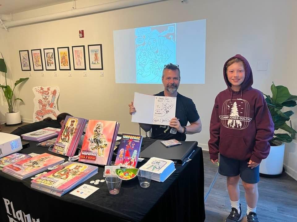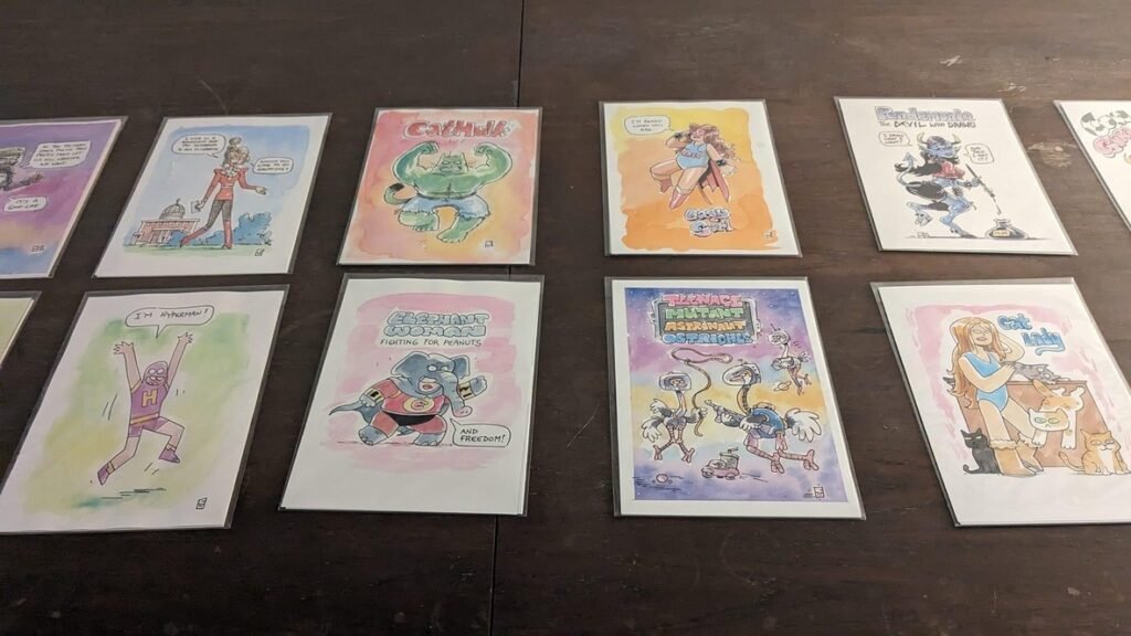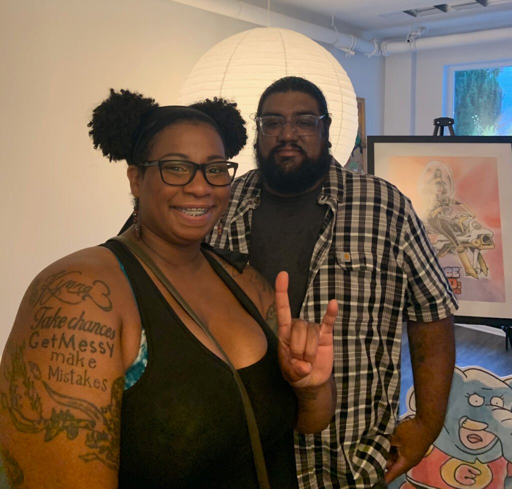 An art show of original watercolor artworks from Urfspace Beyond: Into the Radlands, the latest book by San Francisco-based artist and author, Chuck Whelon, successfully funded on Kickstarter in August 2023. Chuck signed copies of the book, a colorful cartoon tour of the future, including stories, poems and cosmic space persons. Two other new titles from Planet Urf Entertainment were also released: The Future Sounds of Urfspace CD, a soundtrack album of 19 original tunes from current Bay Area bands, and “The Star and the Space Princess” a book of sci-fi short stories by author, Robert L. McCarthy, who was also in attendance.
