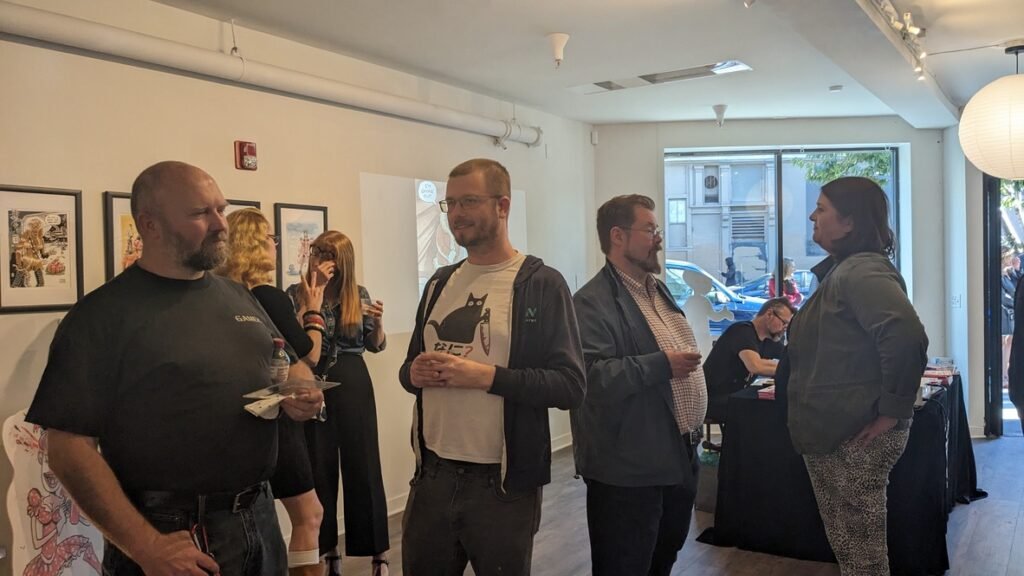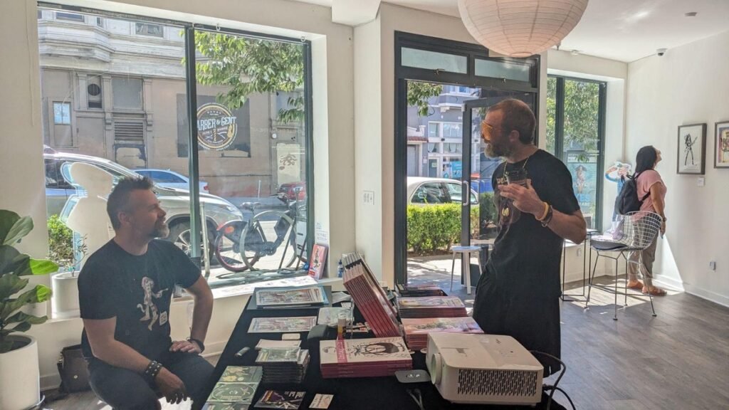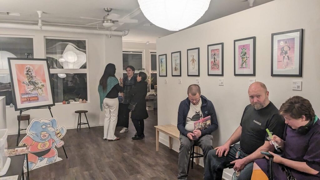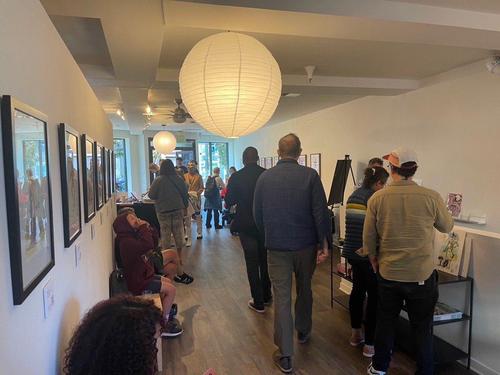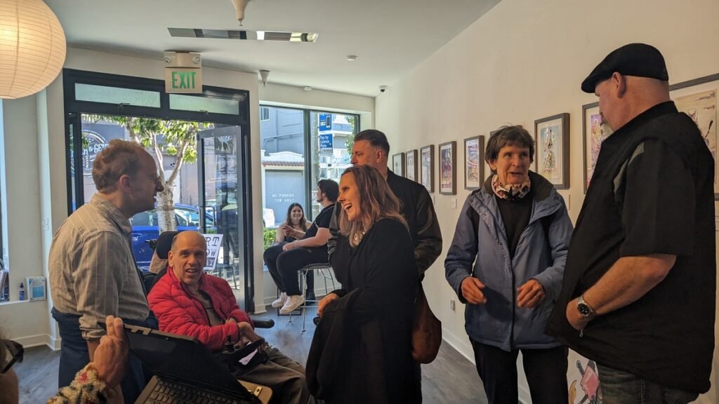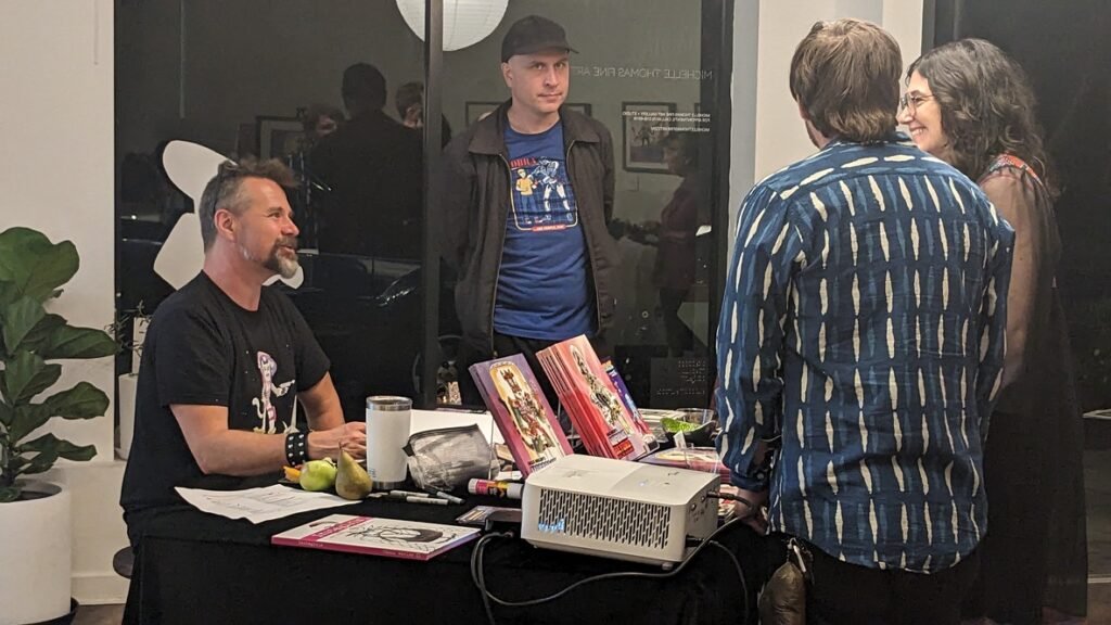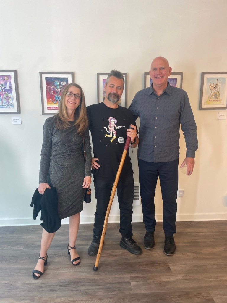 An art show of original watercolor artworks from Urfspace Beyond: Into the Radlands, the latest book by San Francisco-based artist and author, Chuck Whelon, successfully funded on Kickstarter in August 2023. Chuck signed copies of the book, a colorful cartoon tour of the future, including stories, poems and cosmic space persons. Two other new titles from Planet Urf Entertainment were also released: The Future Sounds of Urfspace CD, a soundtrack album of 19 original tunes from current Bay Area bands, and “The Star and the Space Princess” a book of sci-fi short stories by author, Robert L. McCarthy, who was also in attendance.