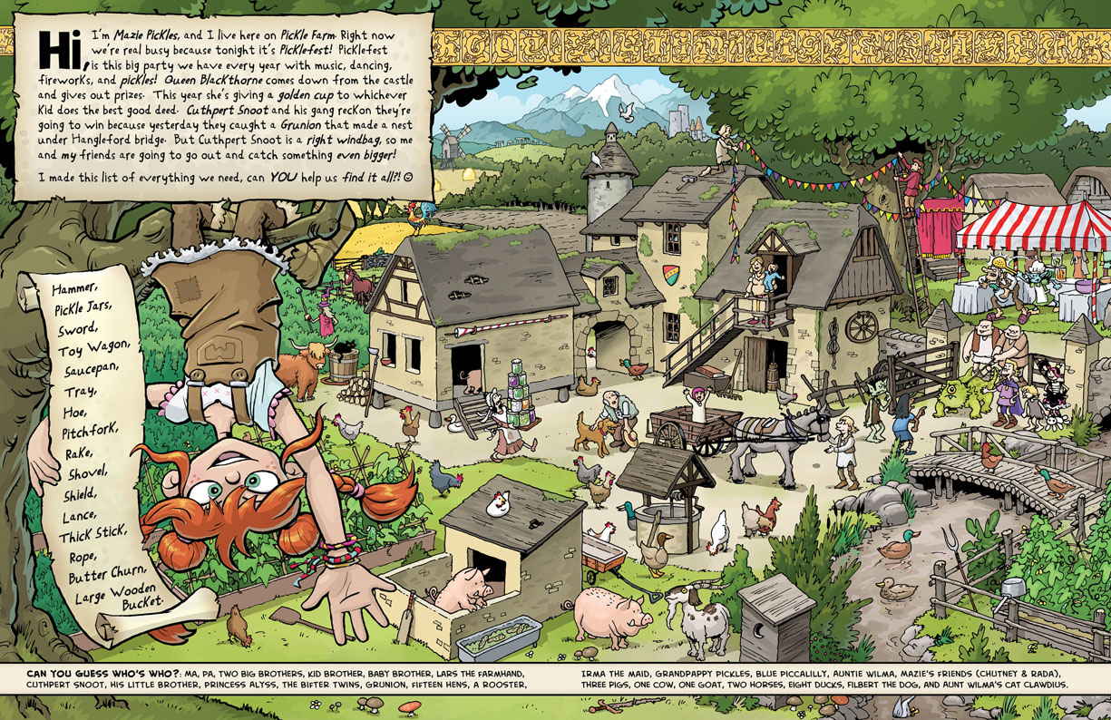 I’m clearly a sucker for a puzzle book I can share with my daughter, and so I was happy that Chuck Whelon, a cartoonist, children’s book author, and boardgame illustrator, let me know about his Kickstarter project Wizard Pickles.