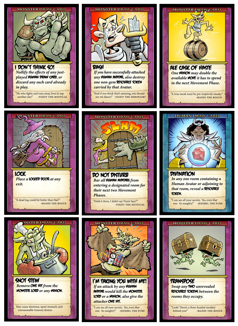 Illustrator Chuck Whelon contributed the box cover art, card illustrations, counters, board tiles, and logo design. He also helped in playtesting and fine-tuning the rules, ensuring both the mechanics and the presentation reflect the game’s lighthearted, chaotic dungeon theme.